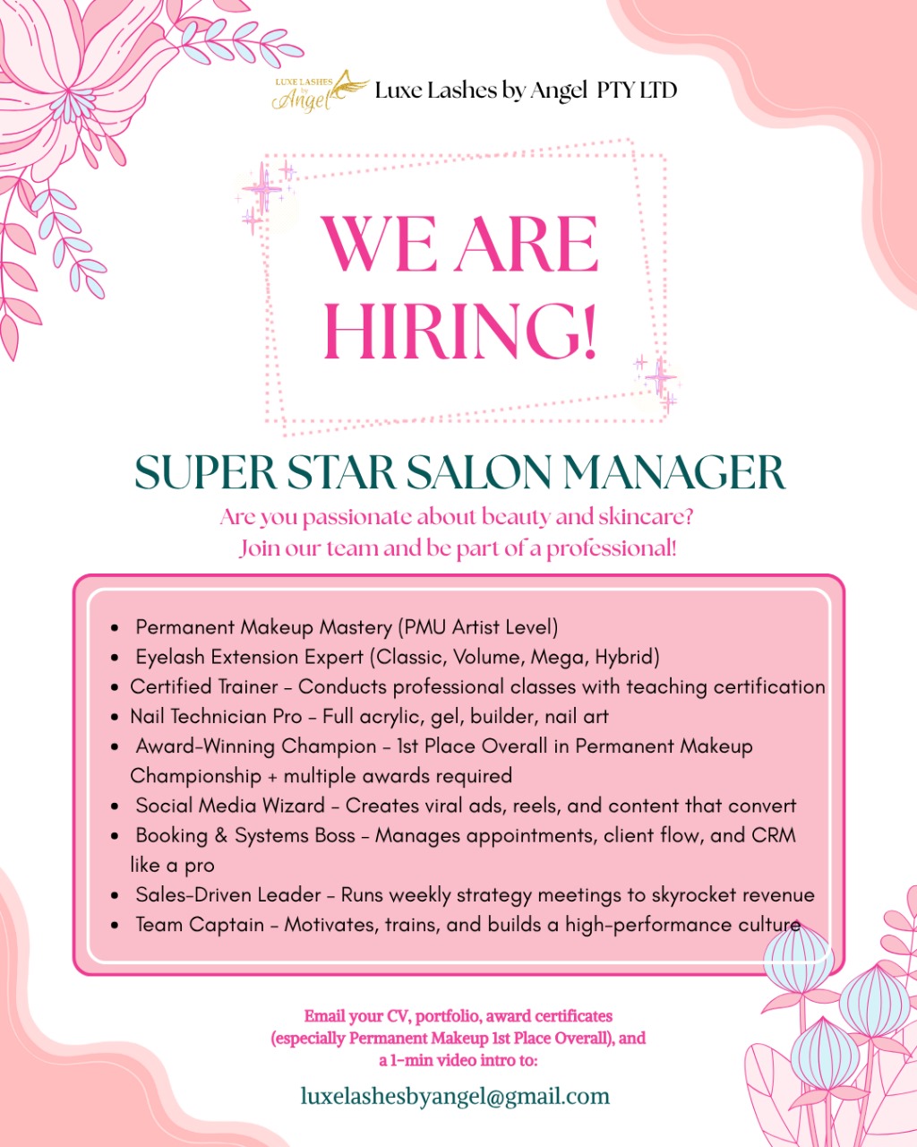 🚨 WE’RE HIRING A SUPERSTAR SALON MANAGER 🚨 Salary: $77,000 – 85,000 Luxe Lashes by Angel PTY LTD is expanding and we’re on the hunt for an elite, multi-talented Salon Manager to lead our dream team to the next level! You must possess all requirements below ✨ You’re the ONE if you have: ✅ Permanent Makeup Mastery (PMU Artist Level)✅ Eyelash Extension Expert (Classic, … Read More We Are Hiring: Salon Manager
